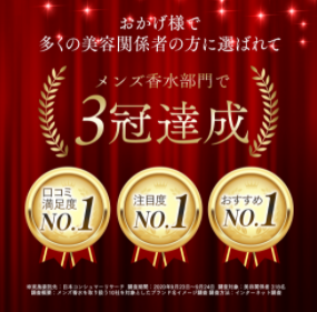 2020年に日本コンシュマーリサーチが行ったネット調査ではメンズ香水10社の中から口コミ満足度No1・注目度No1・おすすめ度No1の三冠を達成。