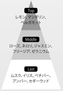 「Top note」は付けて10分程の匂いで、香水の第一印象を決めます。「Middle note」は3時間程まで香る匂いです。「Last note」は4時間以降に香る匂いで最後の余韻を感じることができます。